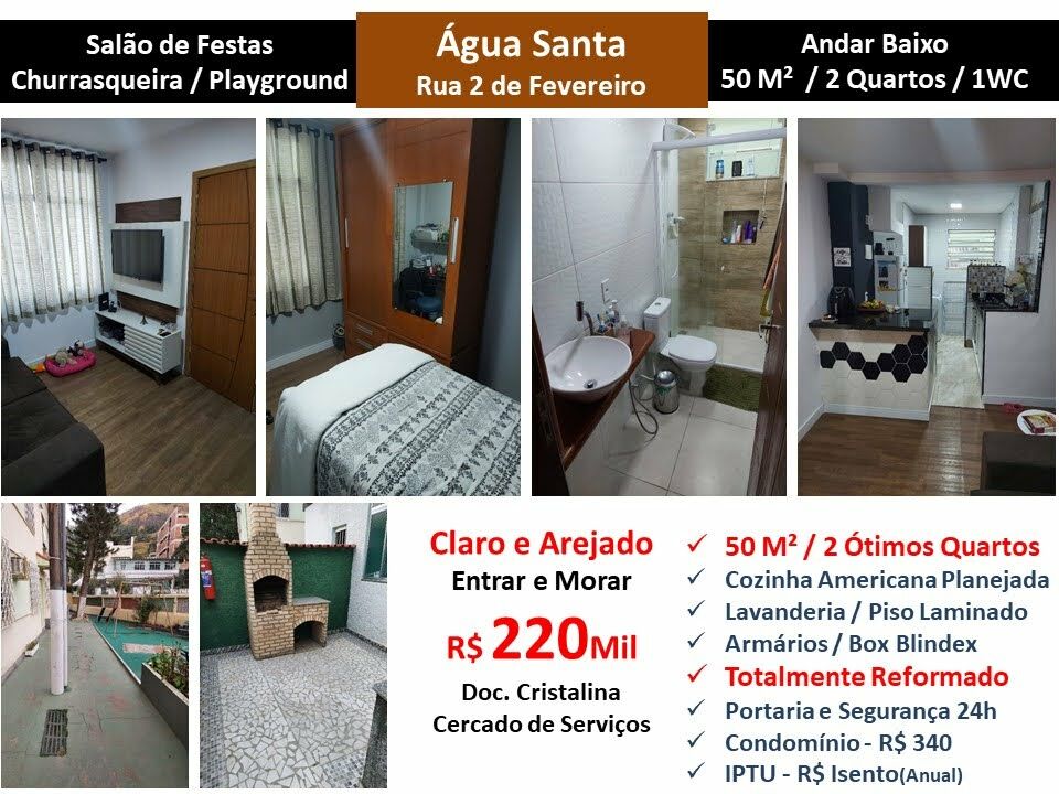 Maravilhoso apartamento em andar baixo claro arejado e totalmente reformado em Agua Santa. São 50 m² com sala, 2 ótimos quartos, banheiro, cozinha Americana planejada e lavanderia. Piso laminado. Armários. Prédio cercado de serviços com playground com salão de festas e churrasqueira e portaria com segurança 24 horas. Entrar e morar!
