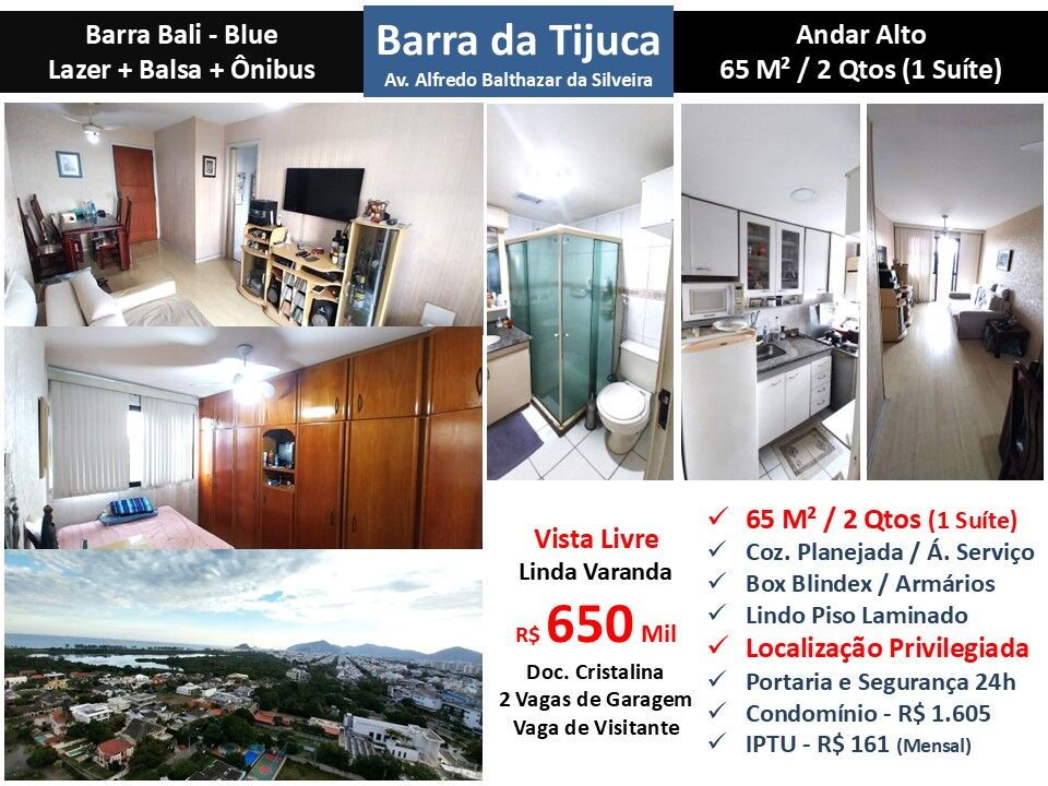 Maravilhoso apartamento em andar alto com vista livre em condomínio em localização privilegiada na Barra da Tijuca. São 65m² com sala, linda varanda, 2 quartos sendo 1 suíte, banheiro social e cozinha planejada com área de serviço. Lindo piso laminado. Armários. 2 vagas de garagem e vaga de visitante. Condomínio com lazer super completo, balsa, ônibus e portaria com segurança 24 horas.