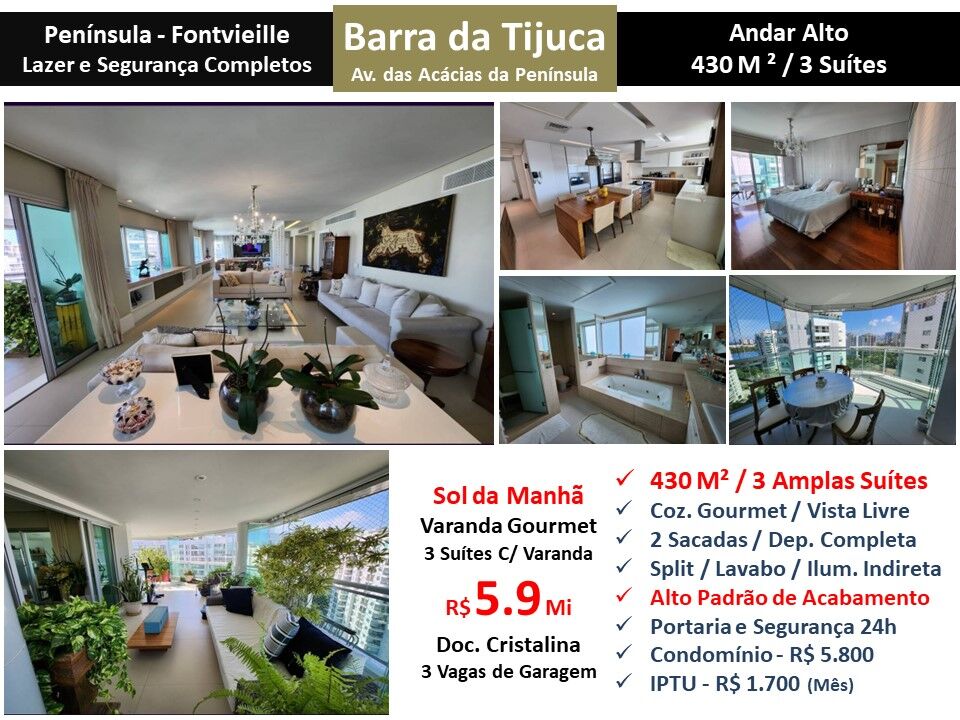 Maravilhoso apartamento em andar alto com alto padrão de acabamento e vista livre em condomínio na Península na Barra da Tijuca. São 296m² com ampla sala, linda varanda gourmet, 2 sacadas, 3 amplas suítes, lavabo, cozinha gourmet com área de serviço e dependência completa. Sol da manhã. Ar condicionado Split. Iluminação indireta. 3 vagas de garagem. Condomínio com lazer completo e portaria com segurança 24 horas.