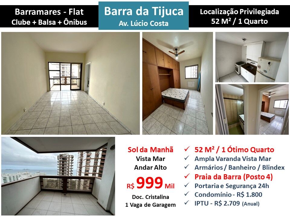 Maravilhoo apartamento quarto e sala em andar alto com vista mar em condomínio em localização privilegiada em frente a praia na Barra da Tijuca. São 52m² com sala, ampla varanda com vista mar, ótimo quarto, banheiro e cozinha. Sol da manhã. Armários. 1 vaga de garagem. Condomínio com lazer de clube, balsa, ônibus e portaria com segurança 24 horas localizado na altura do posto 4 da praia da Barra.