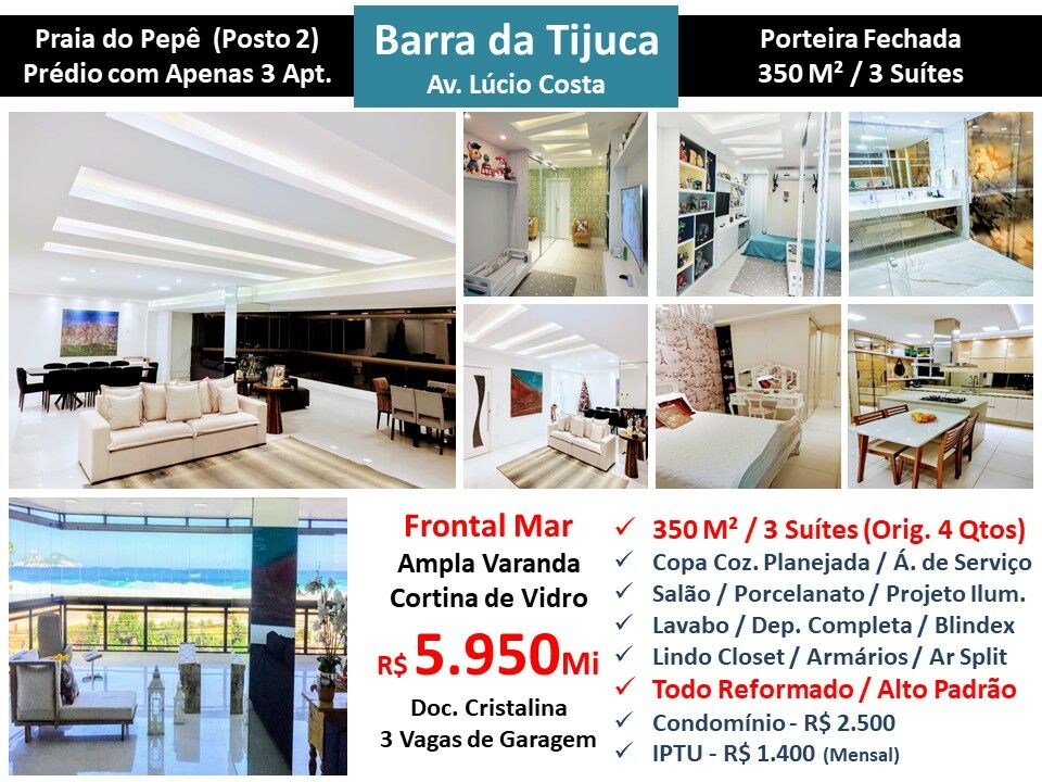 Maravilhoso apartamento de alto padrão de frente para o mar totalmente reformado com projeto de iluminação em localização privilegiada em frente a praia no Jardim Oceânico na Barra da Tijuca. São 350m² com salão, ampla varanda com cortina de vidro, 3 ótimas suítes, lindo closet, lavabo, cozinha planejada com copa, área de serviço e dependência completa. Original 4 quartos. Piso porcelanato. Armários. Ar condicionado Split. 3 vagas de garagem. Prédio com apenas 3 apartamentos localizado na Praia do Pepe na altura do posto 2. Porteira fechada!