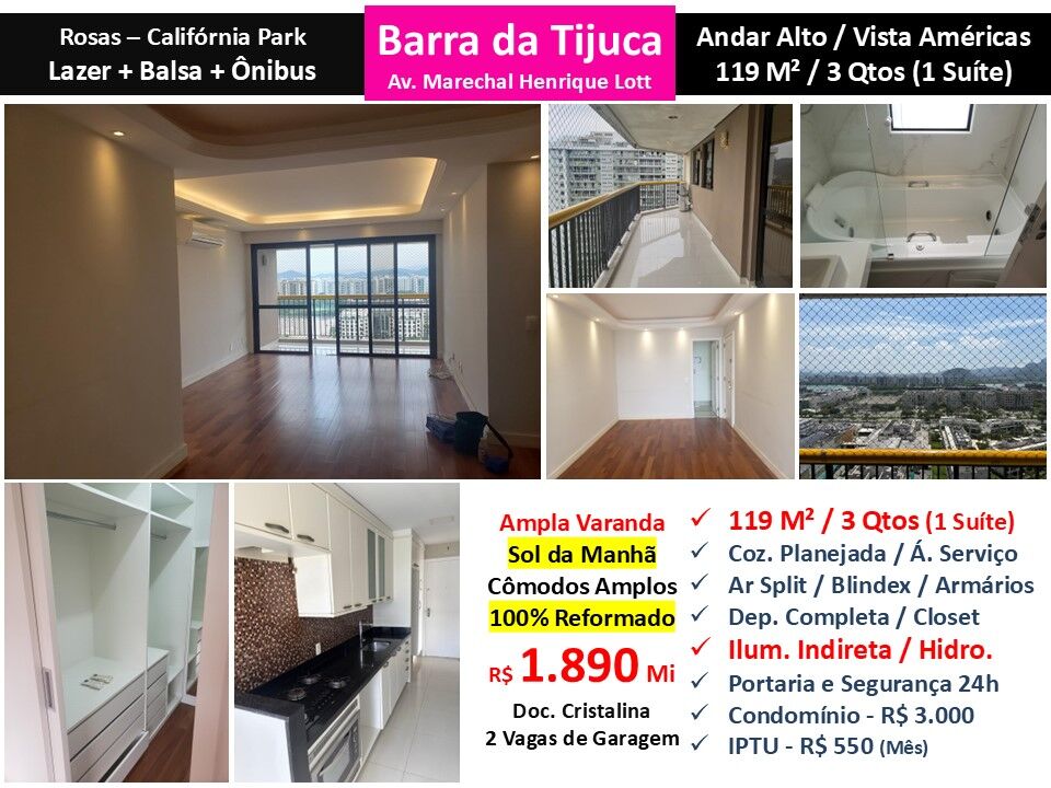 Maravilhoso apartamento 100% reformado, em andar alto , sol da manhã com cômodos amplos e alto padrão de acabamento com vista livre em condomínio em localização privilegiada no Parque das Rosas na Barra da Tijuca. São 119m² com sala ampla, linda varanda, 3 quartos sendo 1 suíte, closet, banheiro social e cozinha planejada com área de serviço. Armários, Hidro, Ar Split. Linda Iluminação Indireta. 2 vagas de garagem e vaga de visitante. Condomínio com lazer completo, ônibus, balsa e portaria com segurança 24 horas.