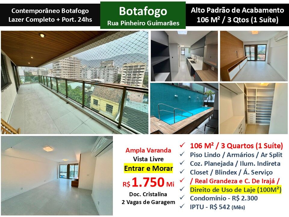 Maravilhoso apartamento com alto padrão de acabamento e vista livre em condomínio em Botafogo. São 106m² com sala, ampla varanda, 3 quartos sendo 1 suíte, closet, banheiro social e cozinha planejada com área de serviço. Direito de uso de laje de 100m². Piso lindo. Armários. Ar condicionado Split. Iluminação indireta. 2 vagas de garagem. Condomínio com lazer completo e portaria 24 horas localizado entre as Ruas Real Grandeza e Conde de Irajá. Entrar e morar!