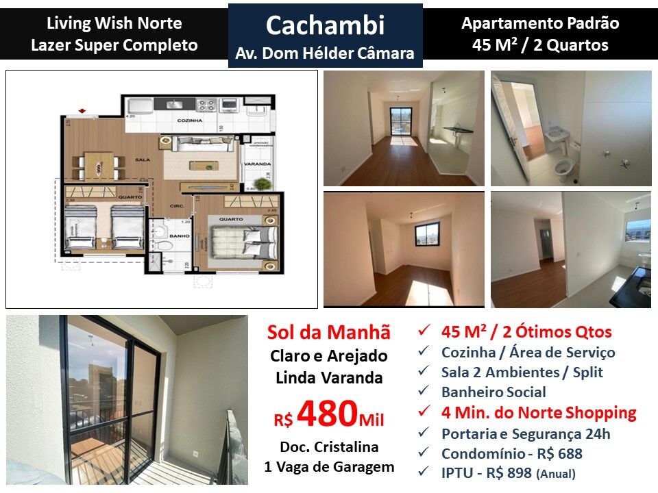 Maravilhoso apartamento claro e arejado em condomínio no Cachambi. São 45m² com sala em 2 ambientes, linda varanda, 2 ótimos quartos, banheiro e cozinha com área de serviço. Sol da manhã. Ar condicionado Split. 1 vaga de garagem. Condomínio com lazer super completo e portaria com segurança 24 horas localizado a 4 minutos do Norte Shopping.
