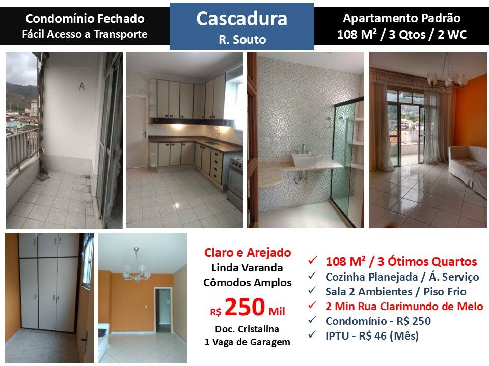 Maravilhoso apartamento com cômodos amplos claro e arejado em condomínio em Cascadura. São 108m² com sala em 2 ambientes, linda varanda, 3 ótimos quartos, 2 banheiros e cozinha planejada com área de serviço. Piso frio. 1 vaga de garagem. Condomínio com fácila ceasso a transporte localizado a 2 minutos da Rua Clarimundo de Melo.