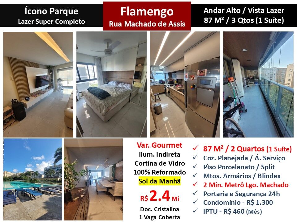 Maravilhoso apartamento em andar alto 100% reformado com vista para o lazer em condomínio em localização privilegiada no Flamengo. São 87m² com sala, linda varanda gourmet com cortina de vidro, 2 quartos sendo 1 suíte, banheiro social e cozinha planejada com área de serviço. Sol da manhã. Piso porcelanato. Muitos armários. Ar condicionado Split. Iluminação indireta. 1 vaga de garagem coberta. Condomínio com lazer super completo e portaria com segurança 24 horas localizado a 2 minutos do metrô Largo do Machado.