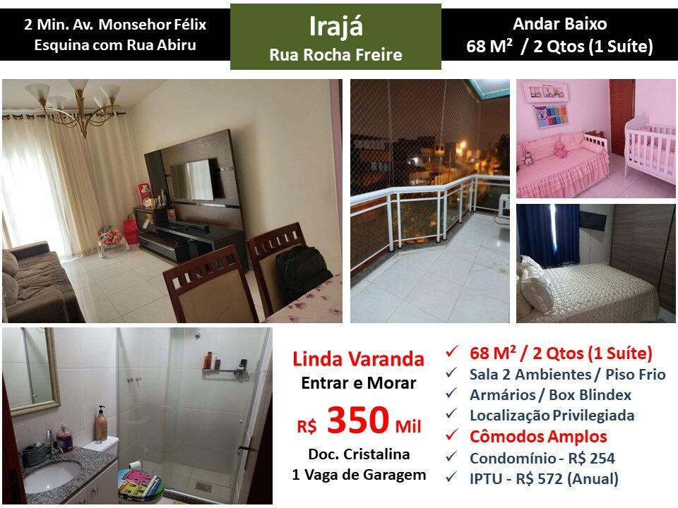 Maravilhoso apartamento em andar baixo com cômodos amplos em localização privilegiada em Irajá. São 68 m² com sala em 2 ambientes, linda varanda, 2 quartos sendo 1 suíte, banheiro social e cozinha. Piso frio. Armários. 1 vaga de garagem. Prédio na esquina da Rua Abiru cercado de serviços localizado a 2 minutos da Av Monsenhor Félix. Entrar e morar!