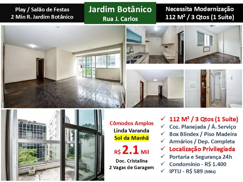 Maravilhoso apartamento com cômodos amplos em localização privilegiada no Jardim Botânico. São 112m² com sala, linda varanda, 3 quartos sendo 1 suíte, banheiro social, cozinha planejada com área de serviço e dependência completa. Sol da manhã. Piso em madeira. Armários. 2 vagas de garagem. Prédio com playground com salão de festa e portaria com segurança 24 horas localizado a 2 minutos da Rua Jardim Botânico. Necessita modernização!