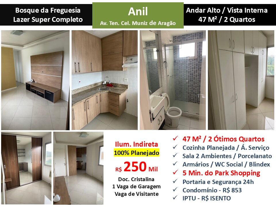 Maravilhoso apartamento em andar alto 100% planejado com vista livre em condomínio em localização privilegiada no Anil em Jacarepaguá. São 47m² com sala em 2 ambientes, 2 ótimos quartos, banheiro e cozinha planejada com área de serviço. Piso porcelanato. Armários. 1 vaga de garagem. Condomínio com lazer super completo e portaria com segurança 24 horas localizado a 5 minutos do Park Shopping.