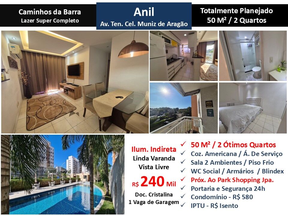 Maravilhoso apartamento totalmente planejado com vista livre em condomínio no Anil em Jacarepaguá. São 50m² com sala em 2 ambientes, linda varanda, 2 ótimos quartos, banheiro e cozinha Americana planejada com área de serviço. Piso frio. Armários. Iluminação indireta. 1 vaga de garagem. Condomínio com lazer super completo e portaria com segurança 24 horas localizado próximo ao Park Shopping Jacarepaguá.