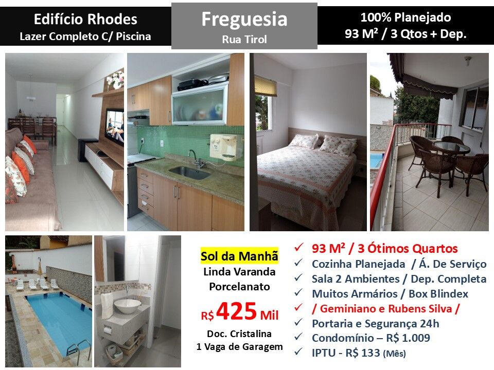 Maravilhoso apartamento 100% planejado em condomínio em localização privilegiada na Freguesia em Jacarepaguá. São 93m² com sala em 2 ambientes, linda varanda, 3 ótimos quartos, banheiro, cozinha planejada com área de serviço e dependência completa. Sol da manhã. Piso porcelanato. Muitos armários. 1 vaga de garagem. Condomínio com lazer completo com piscina e portaria com segurança 24 horas localizado entre as Ruas Geminiano Góis e Rubens Silva.