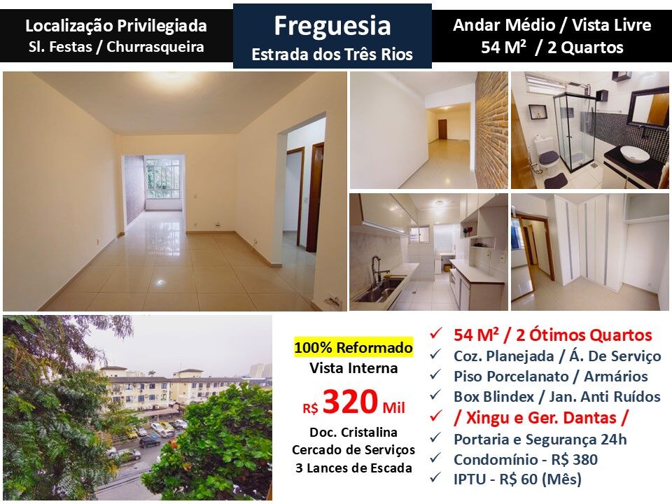 Maravilhoso apartamento em andar médio 100% reformado com vista interna em localização privilegiada na Freguesia em Jacarepaguá. São 54m² com sala, 2 ótimos quartos, banheiro e cozinha planejada com área de serviço. Piso porcelanato. Armários. Janela antiruído. Prédio cercado de serviço com salão de festa, churrasqueira e portaria com segurança 24 horas localizado entre as Ruas Xingu e Geremario Dantas. 3 lances de escada.