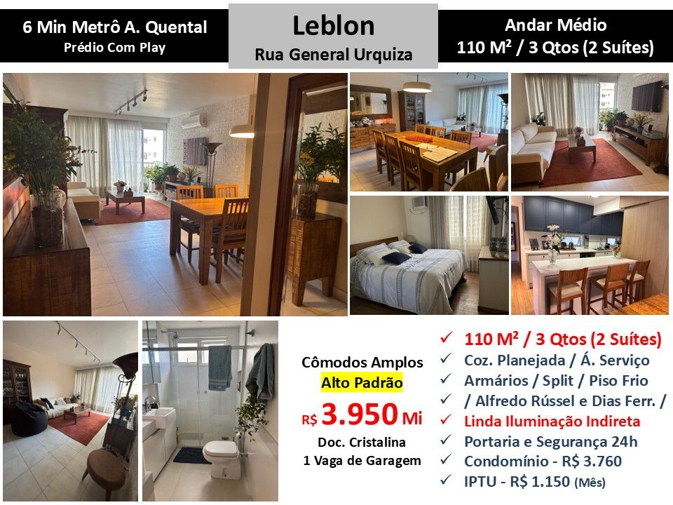 Maravilhoso apartamento de alto padrão em andar médio com cômodos amplos em localização privilegiada no Leblon. São 110m² com sala, 3 quartos, sendo 2 suítes e cozinha planejada com área de serviço. Piso frio. Armários. Ar condicionado Split. Linda iluminação indireta. 1 vaga de garagem. Prédio com playground e portaria com segurança 24 horas localizado entre as Ruas Desembargador Alfredo Russel e Dias Ferreira a 6 minutos do metrô Antero de Quental.