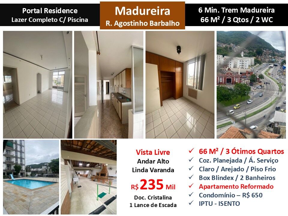 Maravilhoso apartamento em andar alto claro arejado e reformado com vista livre em condomínio em Madureira. São 77m² com ampla sala, linda varanda, 3 ótimos quartos, 2 banheiros e cozinha planejada com área de serviço. Piso frio. Condomínio com lazer completo com piscina localizado a 6 minutos do trem de Madureira. 1 lance de escada.