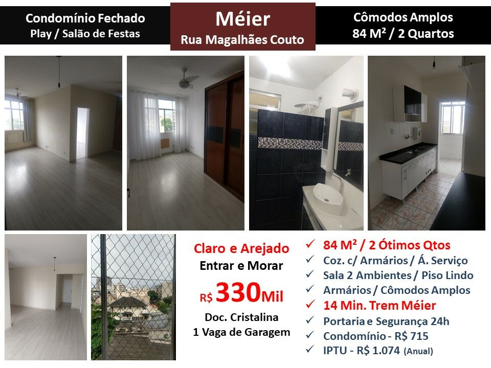 Maravilhoso apartamento com cômodos amplos claro e arejado em condomínio fechado no Meier. São 84m² com sala em 2 ambientes, 2 ótimos quartos, banheiro, cozinha com armários e área de serviço. Armários. 1 vaga de garagem. Condomínio com playground com salão de festas e portaria com segurança 24 horas localizado a 14 minutos do Trem Meier. Entrar e morar!