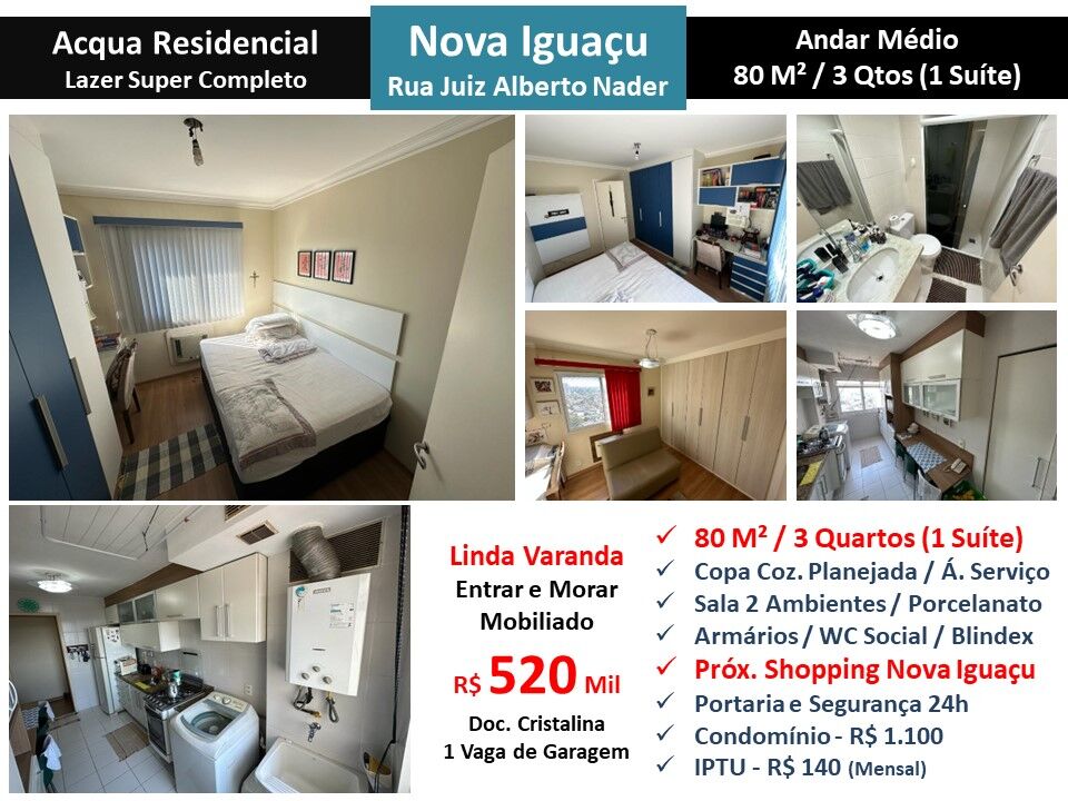 Maravilhoso apartamento em andar médio mobiliado em condomínio em Nova Iguaçu. São 80m² com sala em 2 ambientes, linda varanda, 3 quartos sendo 1 suíte, banheiro social, cozinha planejada com copa e área de serviço. Piso porcelanato. Armários. 1 vaga de garagem. Condomínio com lazer super completo e portaria com segurança 24 horas localizado próximo ao Shopping Nova Iguaçu. Entrar e morar!