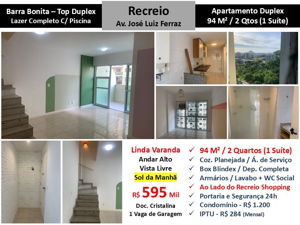 Maravilhoso apartamento duplex em andar alto com vista livre em condomínio em localização privilegiada na Barra Bonita no Recreio dos Bandeirantes. São 94m² com sala, linda varanda, 2 quartos sendo 1 suíte, banheiro social, lavabo, cozinha planejada com área de serviço e dependência completa. Sol da manhã. Armários. 1 vaga de garagem. Condomínio com lazer completo com piscina e portaria com segurança 24 horas localizado ao lado do Recreio Shopping.