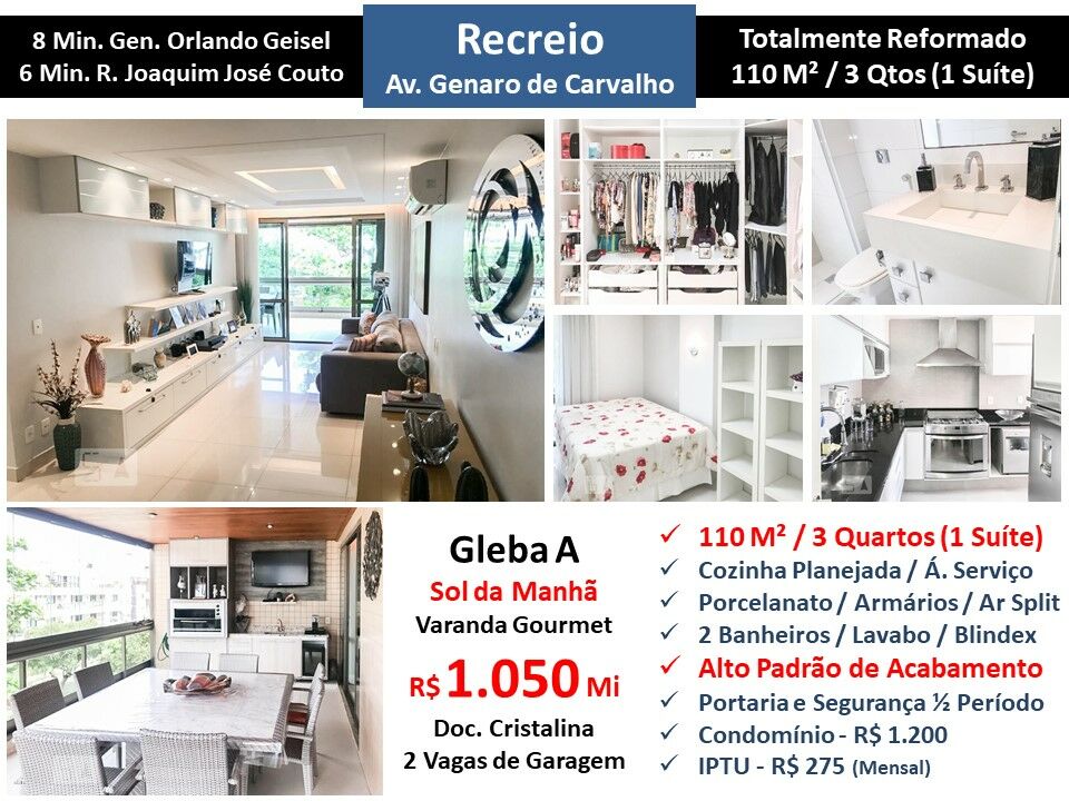 Maravilhoso apartamento totalmente reformado com alto padrão de acabamento na Gleba A no Recreio dos Bandeirantes. São 110 m² com sala, varanda gourmet, 3 quartos sendo 1 suíte, banheiro social, lavabo e cozinha planejada com área de serviço. Sol da manhã. Piso porcelanato. Armários. Ar condicionado Split. 2 vagas de garagem. Prédio com portaria e segurança em meio período localizado a 8 minutos da Rua General Orlando Geisel e a 6 minutos da Rua Joaquim José Couto.