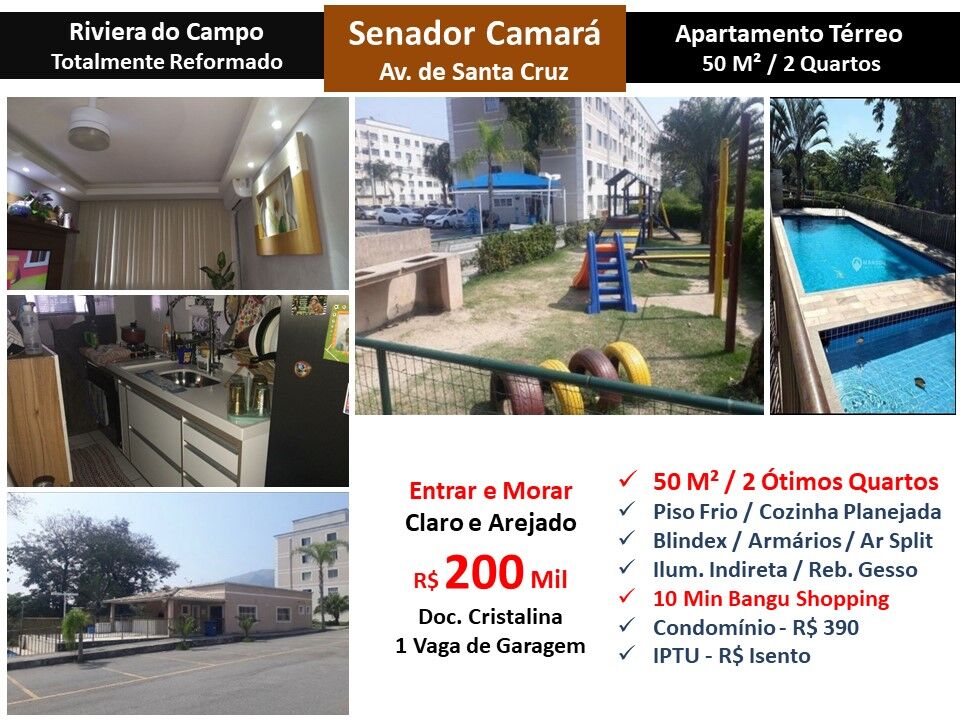 Maravilhoso apartamento térreo claro arejado e totalmente reformado em condomínio em Senador Camará. São 50m² com sala, 2 ótimos quartos, banheiro e cozinha planejada. Piso frio. Armários. Ar condicionado Split. Iluminação indireta. 1 vaga de garagem. Condomínio localizado a 10 minutos do Bangu Shopping. Entrar e morar!