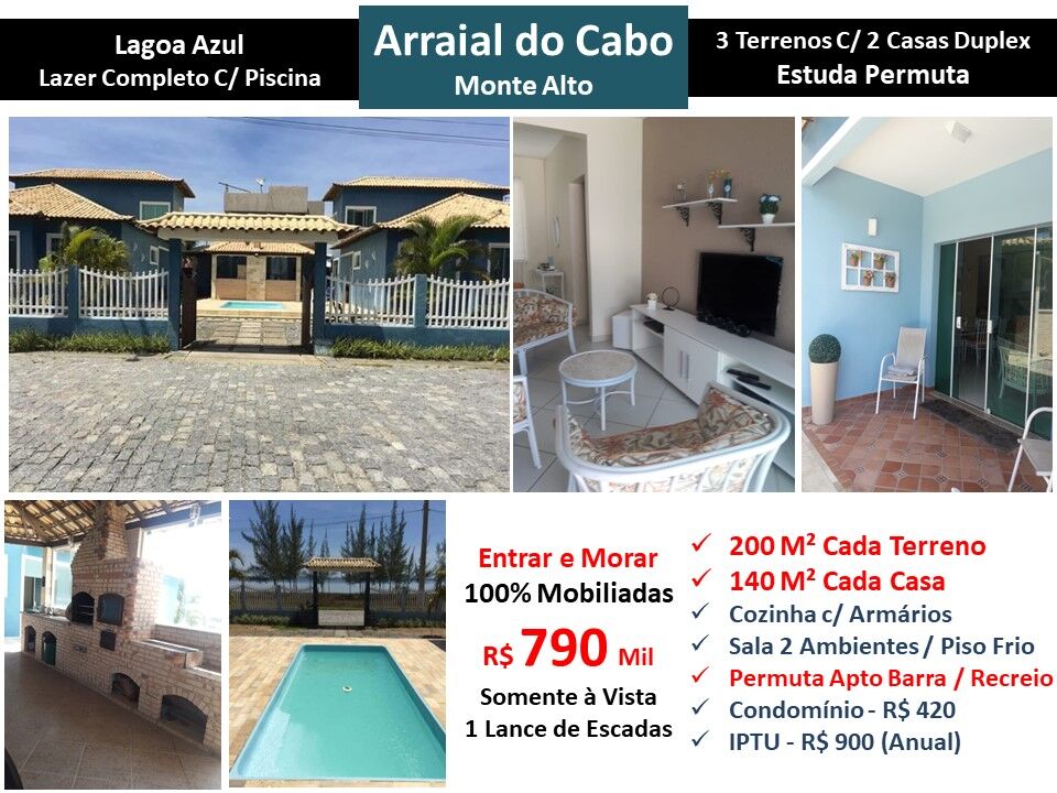 Maravilhosas casas duplex 100% mobiliadas em condomínio no Monte Alto em Arraial do Cabo. São 3 terrenos com 200m² cada com 2 casas com 140m² cada. Piso frio. Condomínio com lazer completo com piscina. 1 lance de escada. Entrar e morar! Estuda permuta por apartamento na Barra ou Recreio!