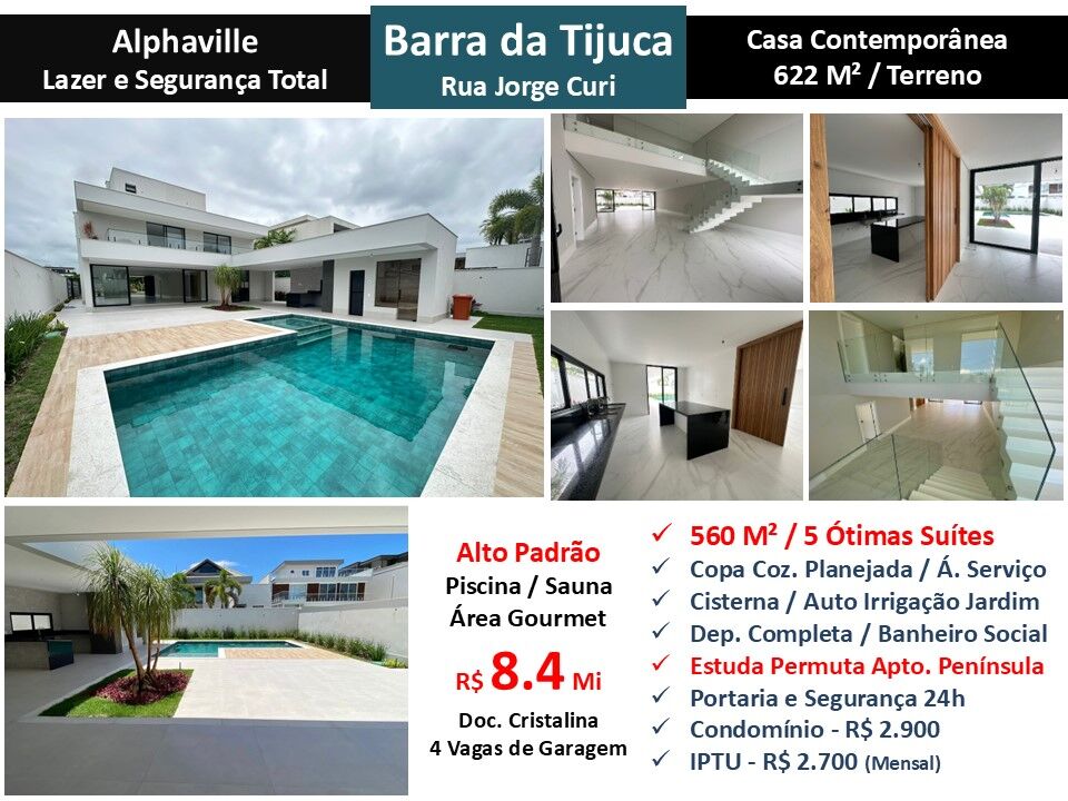 Maravilhosa casa contemporânea de alto padrão em condomínio na Barra da Tijuca. São 622m² de terreno com 560m² construídos divididos em ampla sala, 5 ótimas suítes, banheiro social, cozinha planejada com copa, área de serviço e dependência completa. Área externa com piscina, sauna e espaço gourmet. Jardim com auto irrigação. Cisterna. 4vagas de garagem. Condomínio com lazer e portaria com segurança total 24 horas. Estuda permuta por apartamento na Península!