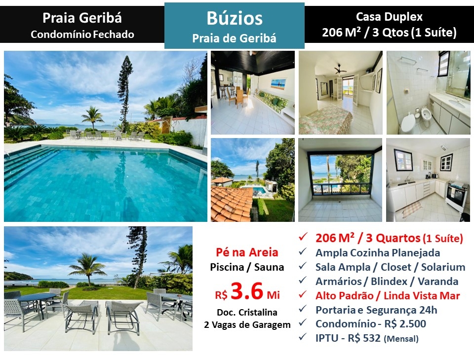 Maravilhosa casa duplex de alto padrão com linda vista mar em condomínio em localização privilegiada em frente a praia em Geribá em Búzios. São 206m² com ampla sala, linda varanda, 3 quartos sendo 1 suíte, closet, banheiro social e ampla cozinha planejada. Área externa com piscina e sauna. Armários. 2 vagas de garagem. Condomínio com portaria e segurança 24 horas. PÉ NA AREIA!