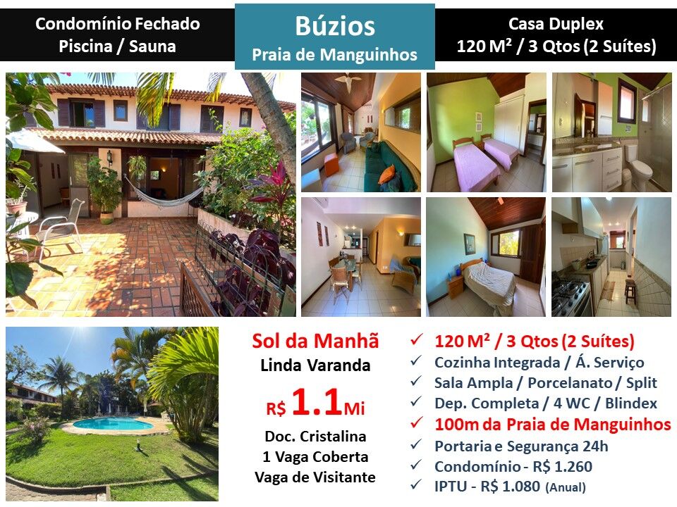 Maravilhosa casa duplex em condomínio em localização privilegiada a 100 metros da praia de Manguinhos em Búzios. São 120m² com ampla sala, linda varanda, 3 quartos sendo 2 suítes, 4 banheiros, cozinha integrada, área de serviço e dependência completa. Sol da manhã. Piso porcelanato. Ar condicionado Split. 1 vaga de garagem coberta e vaga de visitante. Condomínio com piscina, sauna e portaria com segurança 24 horas.