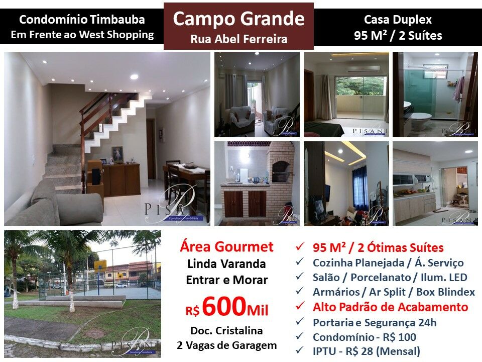 Campo Grande - Rua Abel Ferreira -Cond. Timbauba, em frente ao West Shopping, excelente casa duplex, fino acabamento, toda em porcelanato.. 2 suítes, rebaixamento com iluminaçao em LED, cozinha planejada, área gourmet com churrasqueira...