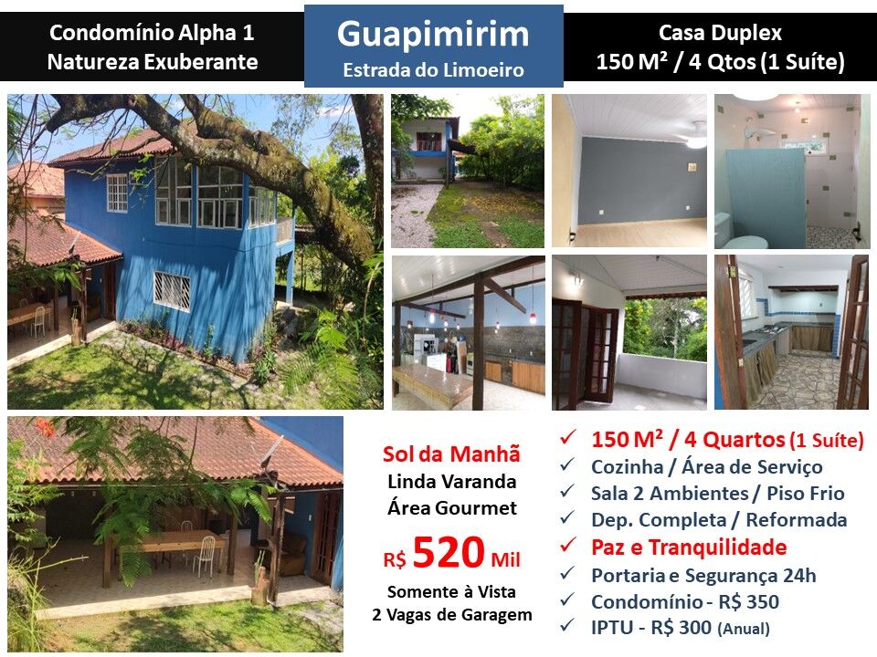 Maravilhosa casa duplex reformada em condomínio em localização privilegiada em Guapimirim. São 150m² com sala em 2 ambientes, linda varanda, 4 quartos sendo 1 suíte, banheiro social, cozinha com área de serviço e dependência completa. Área externa com espaço gourmet. Sol da manhã. Piso frio. 2 vagas de garagem. Condomínio com natureza exuberante e portaria com segurança 24 horas.