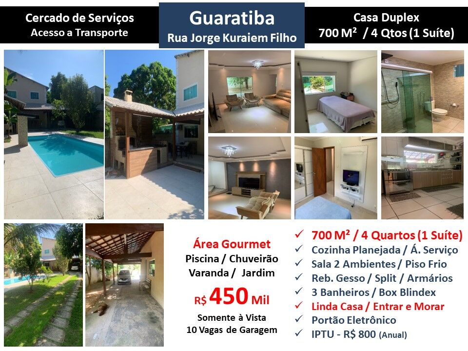 Maravilhosa casa duplex em localização privilegiada em Guaratiba. São 700m² com salão em 2 ambientes, varanda, 4 quartos sendo 1 suíte, 3 banheiros e cozinha planejada com área de serviço. Área externa com piscina, chuveirão, espaço gourmet e jardim. Piso frio. Armários. Ar condicionado Split. 10 vagas de garagem. Casa cercada de serviços com fácil acesso a transporte. Entrar e morar!