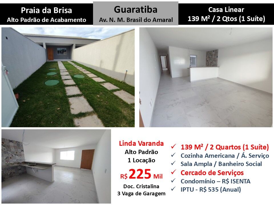 Maravilhosa casa linear de alto padrão com alto padrão de acabamento em localização privilegiada na Praia da Brisa em Guaratiba. São 139m² com ampla sala, linda varanda, 2 quartos sendo 1 suíte, banheiro social e cozinha Americana com área de serviço. 3 vagas de garagem. Casa cercada de serviços. Primeira locação!