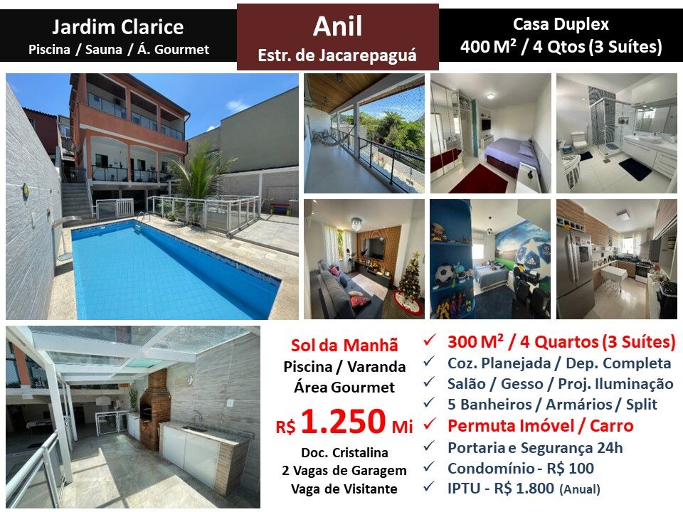 Maravilhosa casa duplex totalmente com projeto de iluminação em condomínio no Anil em Jacarepaguá. São 400m² de terreno com 300m² construídos divididos em salão, varanda, 4 quartos sendo 3 suítes, 5 banheiros, cozinha planejada com área de serviço e dependência completa. Área externa com piscina e espaço gourmet. Sol da manhã. Armários. Ar condicionado Split. 2 vagas de garagem e vaga de visitante. Condomínio com lazer e portaria com segurança 24 horas. Estuda permuta por imóvel ou carro!