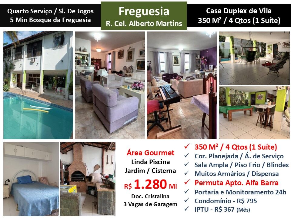 Maravilhosa casa duplex em vila na Freguesia em Jacarepaguá. São 350m² com ampla sala, salão de jogos, 4 quartos sendo 1 suítes, banheiro social, cozinha planejada, despensa, área e quarto de serviço. Área externa com linda piscina, espaço gourmet, cisterna e jardim. Piso frio. Muitos armários. 3 vagas de garagem. Vila com portaria e monitoramento 24 horas localizado a 5 minutos do Bosque da Freguesia. Estuda permuta por apartamento no Alfa Barra!