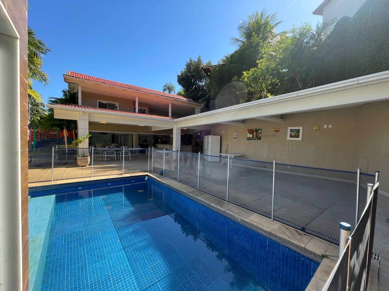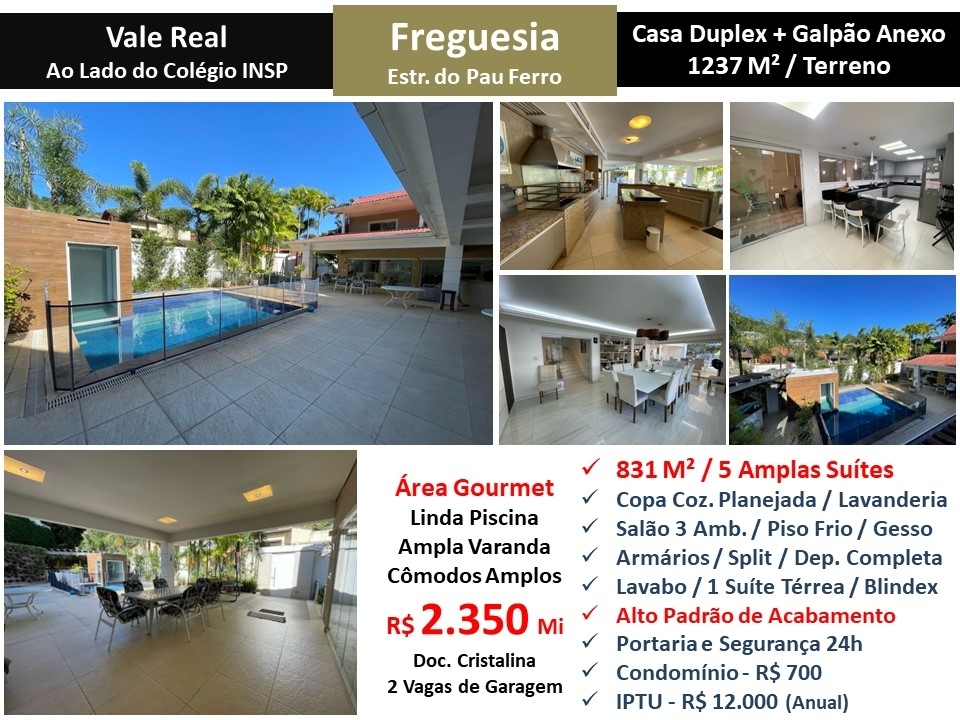 Maravilhosa casa duplex com cômodos amplos e alto padrão de acabamento em condomínio em localização privilegiada na Freguesia em Jacarepaguá. São 1.237m² de terreno com 831m² construídos divididos em salão em 3 ambientes, ampla varanda, 5 amplas suítes sendo 1 no andar térreo, lavabo, cozinha planejada com copa, lavanderia e dependência completa. Galpão anexo. Área externa com linda piscina e espaço gourmet. Piso frio. Armários. Ar condicionado Split. 2 vagas de garagem. Condomínio com portaria e segurança 24 horas localizado ao lado do colégio INSP.