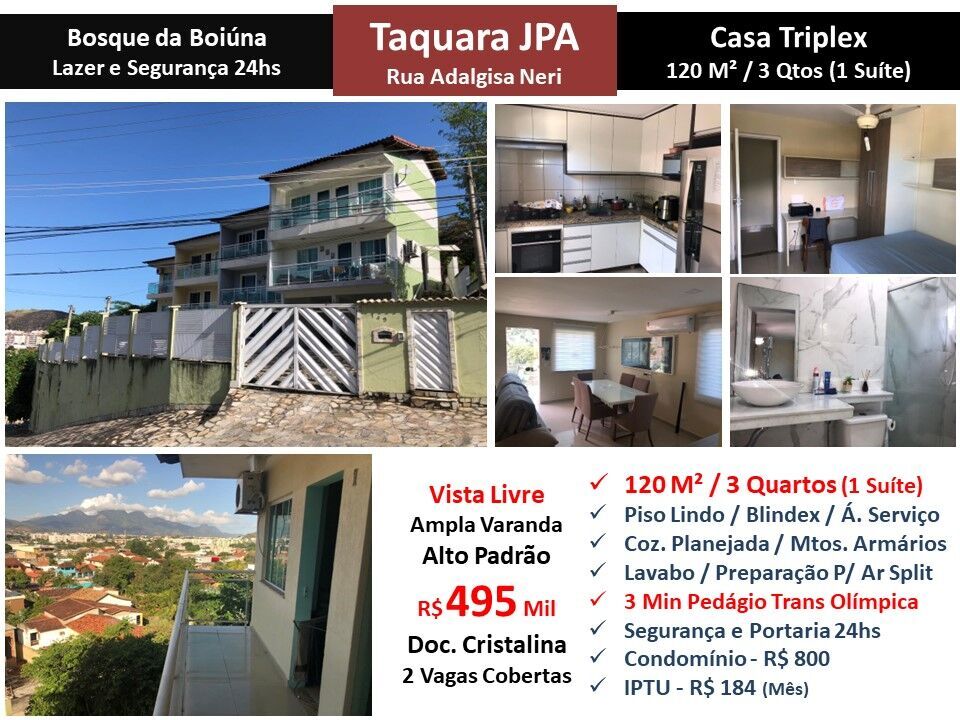 Maravilhosa casa triplex de alto padrão com vista livre em condomínio na Taquara em Jacarepaguá. São 120m² com sala, ampla varanda, 3 quartos sendo 1 suíte, banheiro social, lavabo e cozinha planejada com área de serviço. Piso lindo. Muitos armários. Preparação para ar condicionado Split. 2 vagas de garagem cobertas. Condomínio com lazer e portaria com segurança 24 horas localizado a 3 minutos do pedágio Transolímpica.