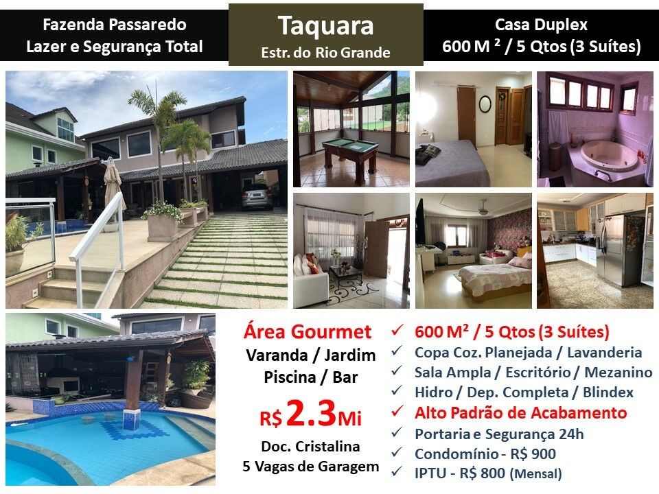 Maravilhosa casa duplex com alto padrão de acabamento em condomínio na Taquara em Jacarepaguá. São 600m² com ampla sala, varanda, 5 quartos sendo 3 suítes, escritório, banheiro social, lavabo, cozinha planejada com copa, lavanderia e dependência completa. Área externa com piscina, espaço gourmet, bar e jardim. 5 vagas de garagem. Condomínio com lazer e portaria com segurança total 24 horas.