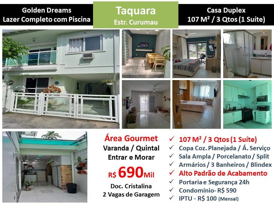 Maravilhosa casa duplex com alto padrão de acabamento em condomínio na Taquara em Jacarepaguá. São 107m² com ampla sala, 3 quartos sendo 1 suíte, 3 banheiros, cozinha planejada com copa e área de serviço. Área externa com quintal com espaço gourmet. Piso porcelanato. Armários. Ar condicionado Split. 2 vagas de garagem. Condomínio com lazer completo com piscina e portaria com segurança 24 horas. Entrar e morar!