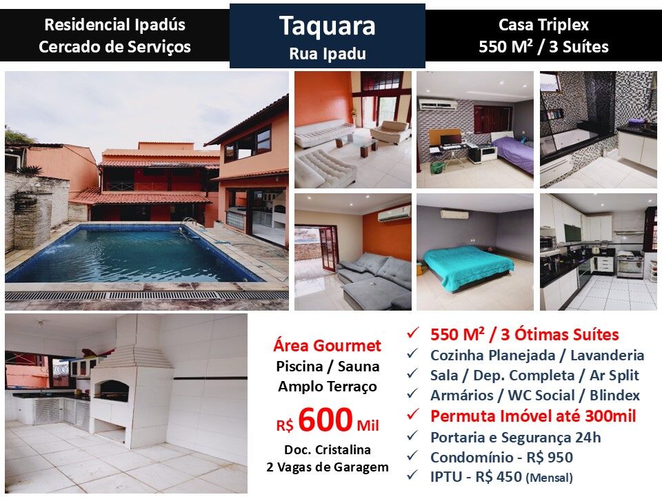 Maravilhosa casa triplex em condomínio em localização privilegiada na Taquara em Jacarepaguá. São 550m² com sala, 3 ótimas suítes, banheiro social, cozinha planejada, lavanderia e dependência completa. Área externa com piscina, sauna e espaço gourmet. Armários. Ar condicionado Split. 2 vagas de garagem. Condomínio cercado de serviços com portaria e segurança 24 horas. Estuda permuta por imóvel até 300 mil!