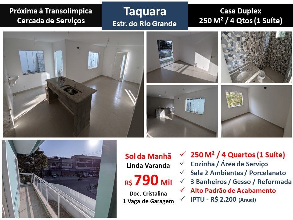 Maravilhosa casa duplex reformada com alto padrão de acabamento na Taquara em Jacarepaguá. São 250m² com sala em 2 ambientes, linda varanda, 4 quartos sendo 1 suíte, 3 banheiros e cozinha com área de serviço. Sol da manhã. Piso porcelanato. 1 vaga de garagem. Casa cercada de serviços localizada próximo a Transolímpica.