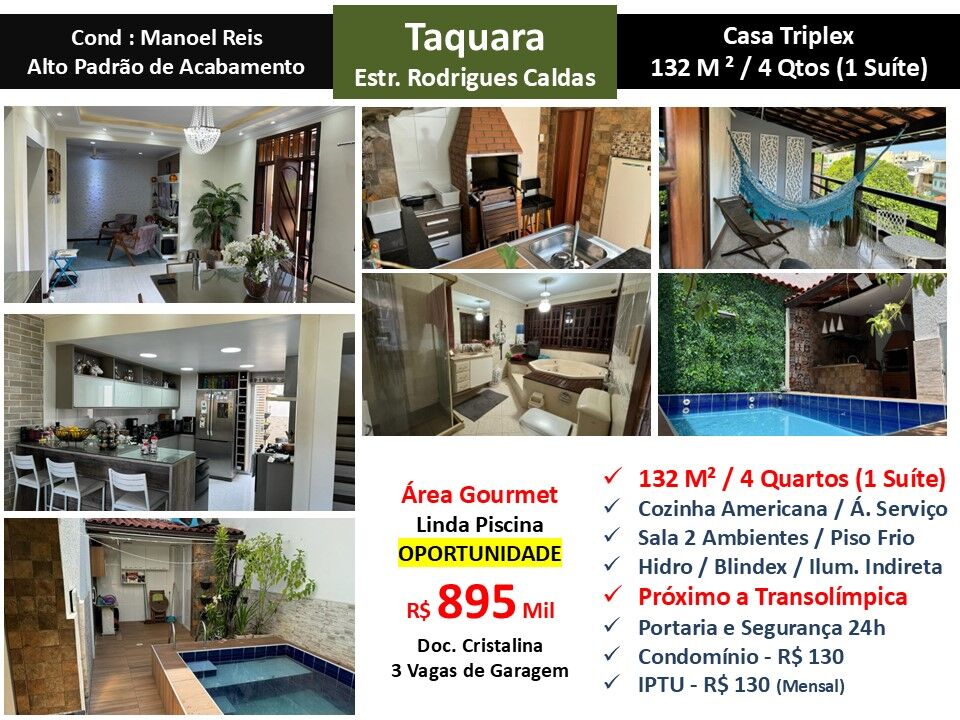 Maravilhosa casa triplex com alto padrão de acabamento em condomínio na Taquara em Jacarepaguá. São 132m² com sala em 2 ambientes, 4 quartos sendo 1 suíte, banheiro social e cozinha Americana planejada com área de serviço. Área externa com linda piscina e espaço gourmet. Piso frio. Iluminação indireta. 3 vagas de garagem. Condomínio com portaria e segurança 24 horas localizado próximo a Transolímpica. OPORTUNIDADE!