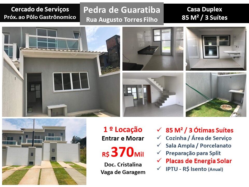 Maravilhosa casa duplex em localização privilegiada em Pedra de Guaratiba. São 85m² com ampla sala, 3 ótimas suítes e cozinha com área de serviço. Piso porcelanato. Preparação para ar condicionado Split. Placas de energia solar. Vaga de garagem. Casa cercada de serviços localizada próximo ao Polo Gastronômico. Entrar e morar! Primeira locação!