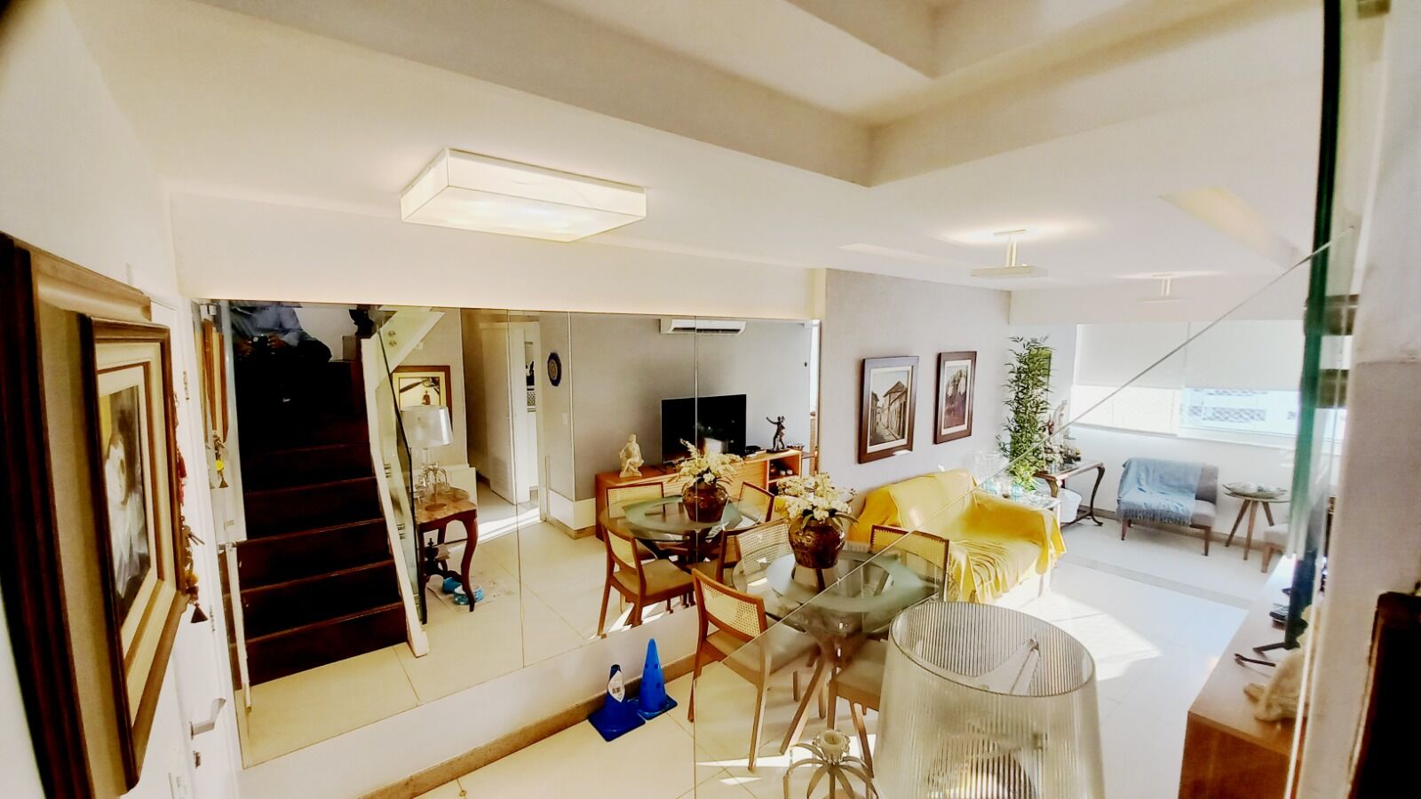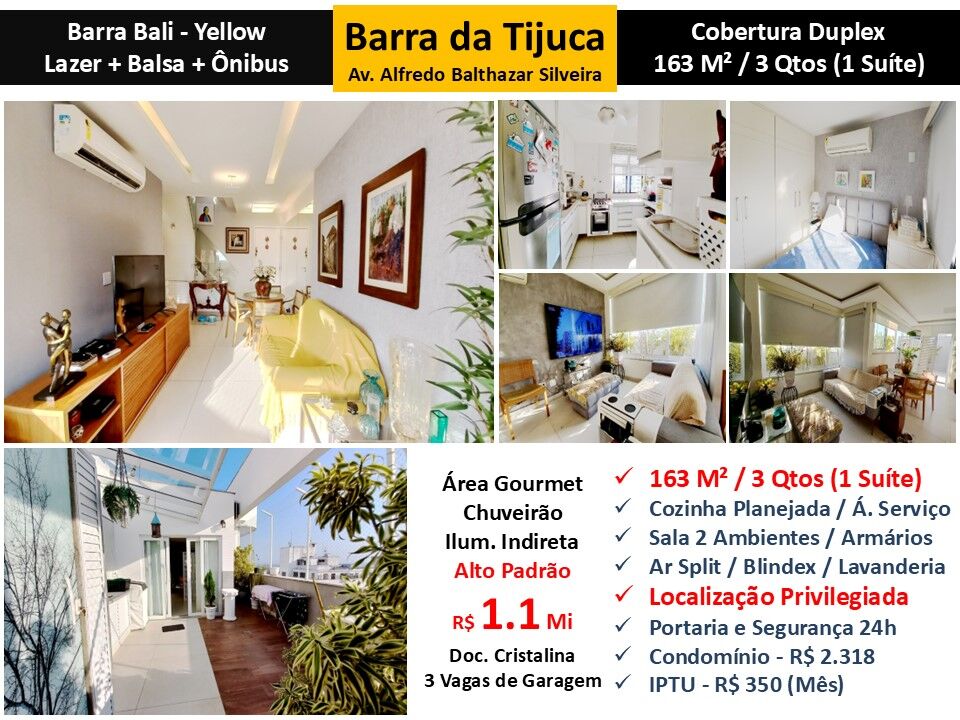 Maravilhosa cobertura duplex de alto padrão em condomínio em localização privilegiada na Barra da Tijuca. São 163m² com sala em 2 ambientes, 3 quartos sendo 1 suíte, banheiro social, cozinha planejada com área de serviço e lavanderia. Área externa com espaço gourmet e chuveirão. Armários. Ar condicionado Split. Iluminação indireta. 3 vagas de garagem. Condomínio com lazer super completo, balsa, ônibus e portaria com segurança 24 horas.