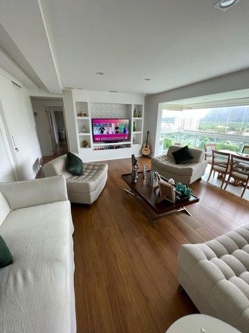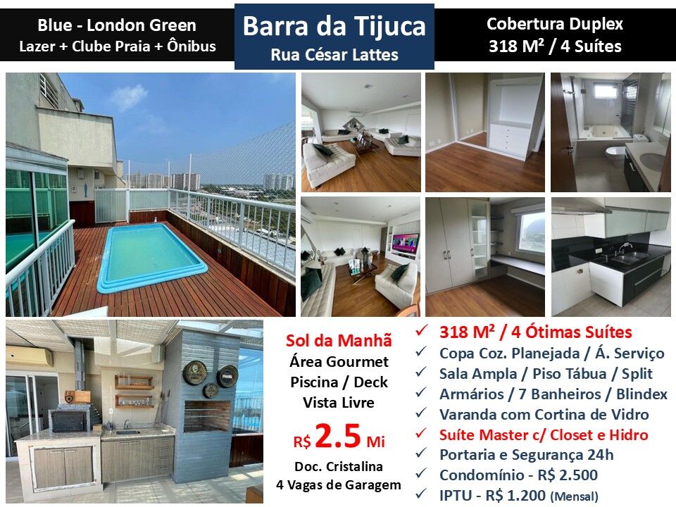Maravilhosa cobertura duplex com livre em condomínio na Barra da Tijuca. São 318m² com ampla sala, linda varanda com cortina de vidro, 4 ótimas suítes sendo 1 máster com closet e hidromassagem, 7 banheiros, cozinha planejada com copa e área de serviço. Área externa com piscina, deck e espaço gourmet. Sol da manhã. Piso em tábua. Armários. Ar condicionado Split. 4 vagas de garagem. Condomínio com lazer super completo, Clube praia, ônibus e portaria com segurança 24 horas.