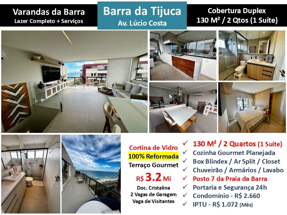 Maravilhosa cobertura duplex , 100% reformada , 2 quartos sendo 1 suíte lateral mar com alto padrão de acabamento em condomínio em localização privilegiada em frente a praia na Barra da Tijuca. São 130m² com sala, ampla varanda, ampla suíte e cozinha planejada. Terraço Gourmet, Chuveirão , Closet. Armários. Ar condicionado Split. 2 vagas de garagem e vaga de visitante. Condomínio com lazer super completo, serviços e portaria com segurança 24 horas localizado na altura do posto 7 da praia da Barra.