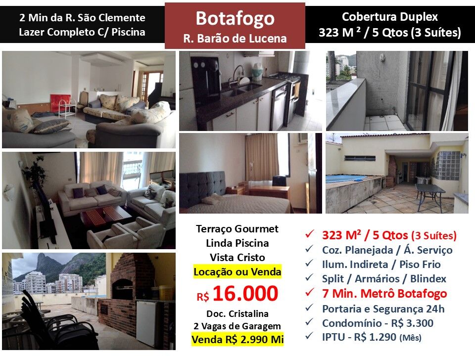 Maravilhosa cobertura duplex com vista para o Cristo Redentor em localização privilegiada em Botafogo. São 323m² com sala, linda varanda, 5 quartos sendo 3 suítes, banheiro social e cozinha planejada com área de serviço. Terraço com área externa com linda piscina e espaço gourmet. Piso frio. Armários. Ar condicionado Split. Iluminação indireta. 2 vagas de garagem. Prédio com lazer completo com piscina e portaria com segurança 24 horas localizado a 2 minutos da Rua São Clemente e a 7 minutos do metrô Botafogo.