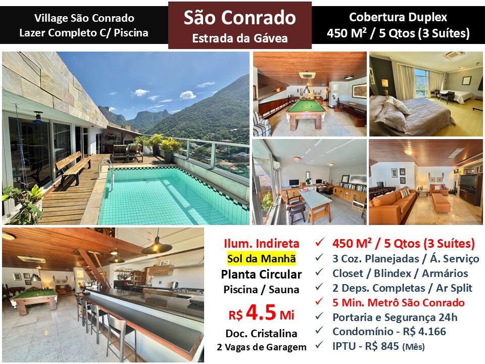 Maravilhosa cobertura duplex com planta circular em condomínio em localização privilegiada em São Conrado. São 450m² com sala, 5 quartos sendo 3 suítes, closet, 3 cozinhas planejadas, área de serviço e 2 dependências completas. Área externa com piscina, sauna e espaço gourmet. Sol da manhã. Armários. Ar condicionado Split. Iluminação indireta. 2 vagas de garagem. Condomínio com lazer completo com piscina e portaria com segurança total 24 horas localizado a 5 minutos do metrô São Conrado.