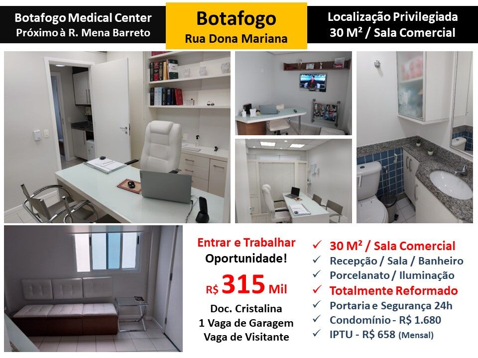 Maravilhosa sala comercial totalmente planejada em Centro Médico em localização privilegiada em Botafogo. São 30m² com sala, recepção e banheiro. Piso porcelanato. 1 vaga de garagem e vaga de visitante. Prédio com portaria e segurança 24 horas localizado próximo a Rua Mena Barreto. Entrar e trabalhar! OPORTUNIDADE!