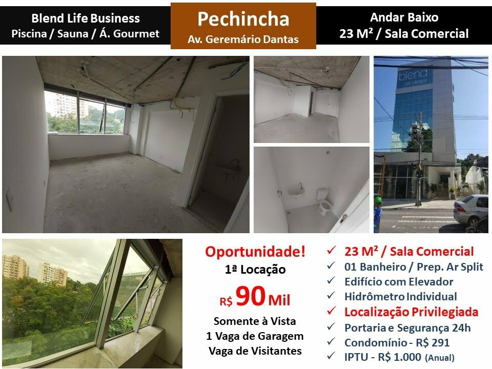 Maravilhosa sala comercial em andar baixo em edifício comercial em localização privilegiada na Pechincha em Jacarepaguá. Área total de 23 m². 1 banheiro. Preparação para ar condiconado Split. 1 vaga de garagem e vaga de visitante. Prédio com lazer e portaria com segurança 24 horas. Primeira locação! OPORTUNIDADE!