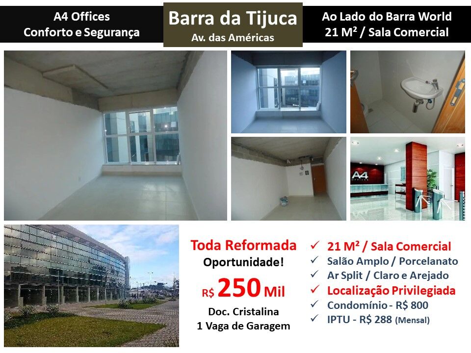 Maravilhosa sala comercial clara arejada e totalmente reformada em condomínio comercial em localização privilegiada no Recreio dos Bandeirantes. São 21m² com amplo salão e banheiro. Piso porcelanato. Ar condicionado Split. 1 vaga de garagem. Condomínio com conforto e segurança localizado ao lado do Barra World. OPORTUNIDADE!