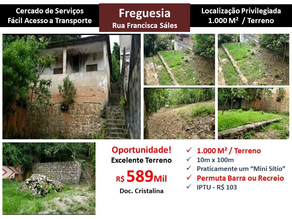 Maravilhoso terreno em localização privilegiada na Freguesia em Jacarepaguá. Área total de 1.000m². Terreno cercado de serviços com fácil acesso a transporte. Estuda permuta por imóvel na Barra ou no Recreio. OPORTUNIDADE!